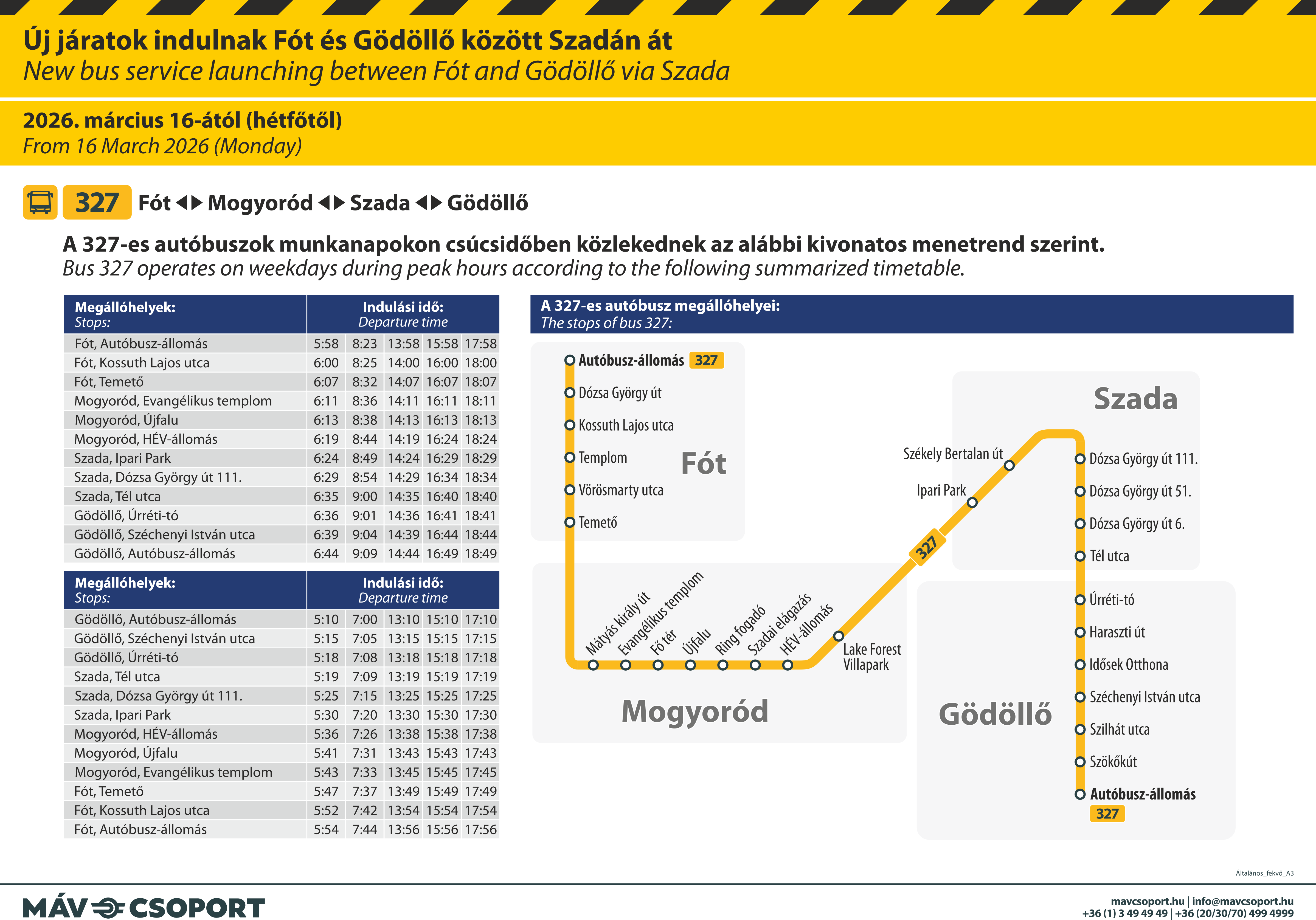 Az új 327-es autóbuszjárat, amely a Fót – Mogyoród – Szada – Gödöllő útvonalon közlekedik munkanapokon.