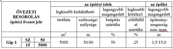 A terület építési övezeti besorolása (beépítési mód, max. beépítési százalék, min./max. építménymagasság, min. telekterület), az építési övezetekhez tartozó min. telekszélesség-telekmélység és min. zöldfelületi százalék a szabályozási terven és az alábbi táblázatban szerepel: