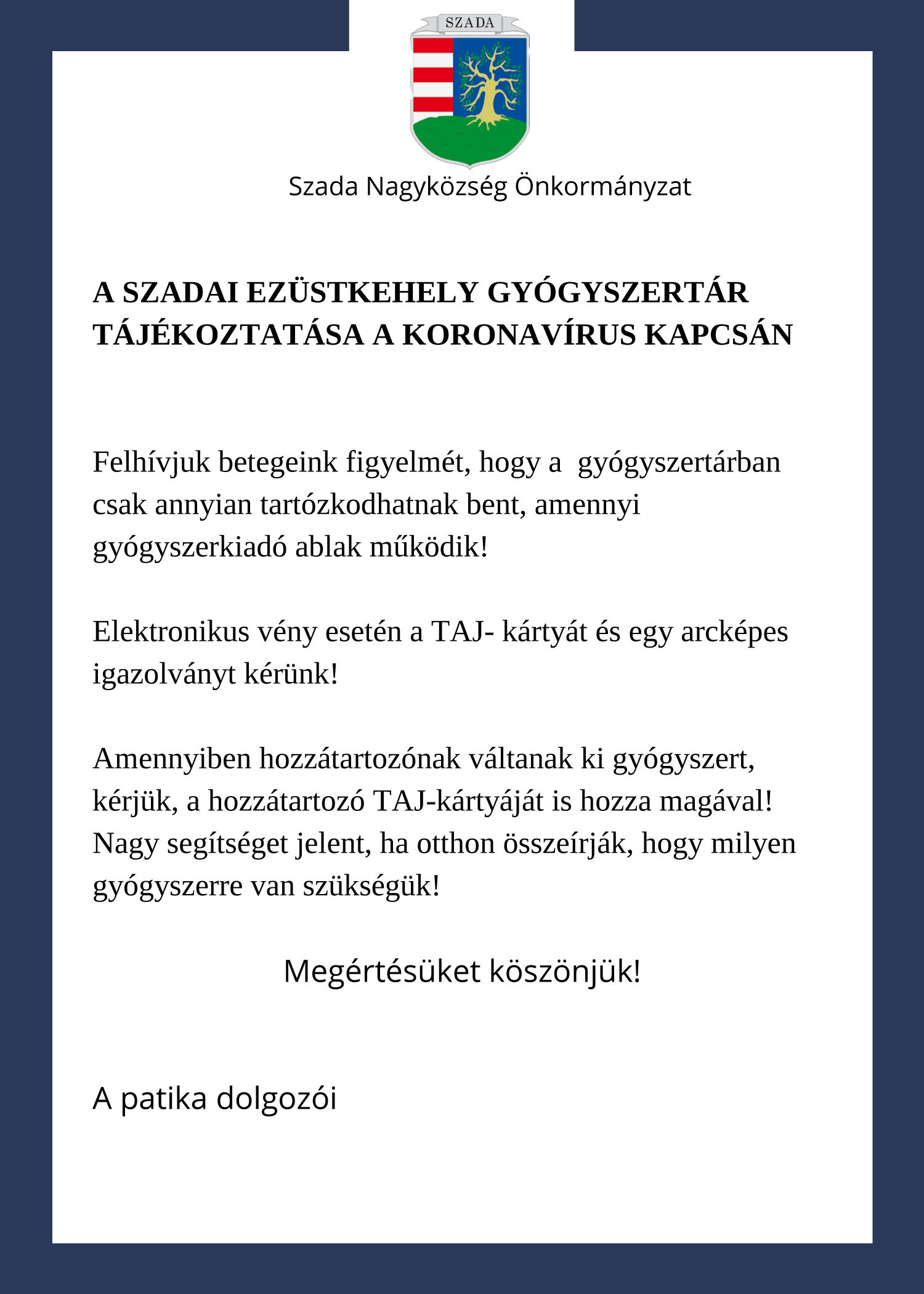 Kezdőlap Hírek A Szadai Ezüstkehely Gyógyszertár tájékoztatása a koronavírus kapcsán A Szadai Ezüstkehely Gyógyszertár tájékoztatása a koronavírus kapcsán 2020. március 20.