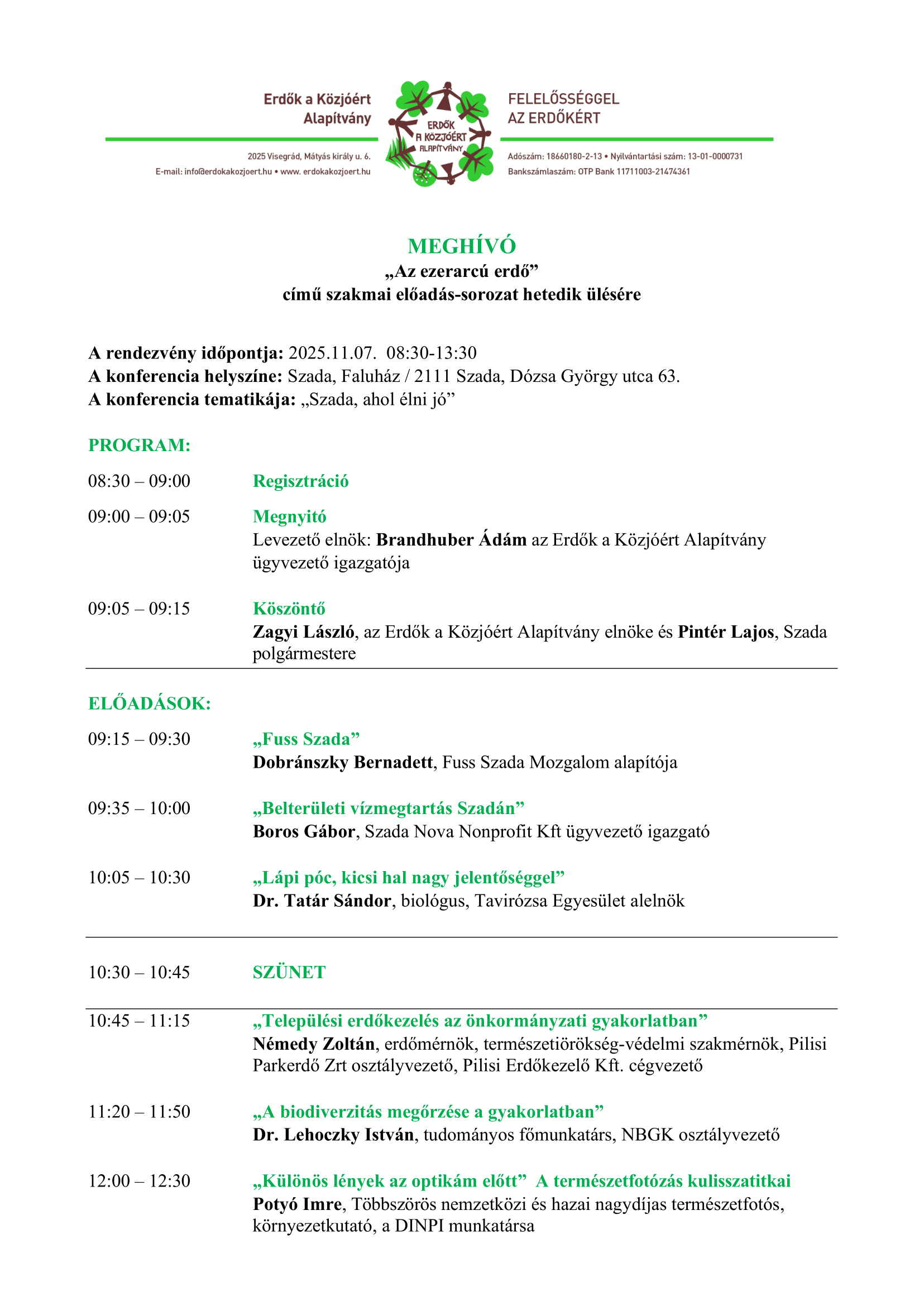 Az Erdők a Közjóért Alapítvány november 7-én pénteken Szadán tartja következő ülését. A konferencián kifejezetten szadai példákon keresztül mutatnak be a környezetünk védelmével kapcsolatos irányokat, kezdeményezéseket, közösségi programokat, amivel demonstrálható, hogy teremthető harmónia az ember és környezete között, az emberi tevékenység hogyan támogathatja a környezet védelmét, a természeti értékek megőrzése mellett hogyan segíthető elő az ember és a természet fenntartható együttélése.