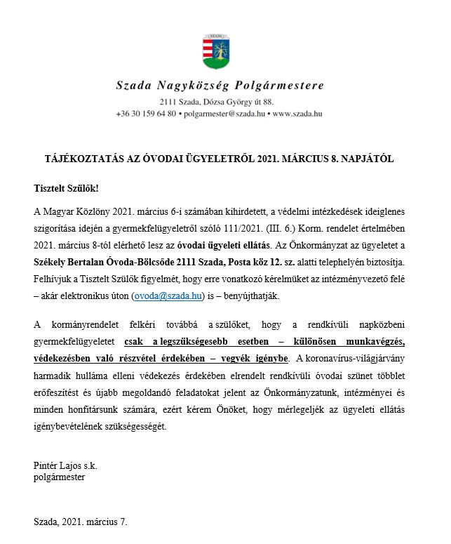 Kezdőlap Hírek Tájékoztatás az óvodai ügyeletről 2021. március 8. napjától Tájékoztatás az óvodai ügyeletről 2021. március 8. napjától 2021. március 7.